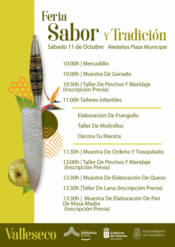 El Ayuntamiento de Valleseco, a través del Área de Desarrollo Local, celebra mañana sábado 11 de octubre el evento “Sabor y Tradición”, una jornada concebida para poner en valor el sector primario, fortalecer la identidad cultural y gastronómica del municipio y dinamizar la economía local mediante una amplia programación de actividades dirigidas a toda la familia.
